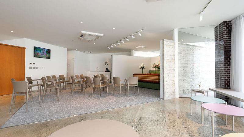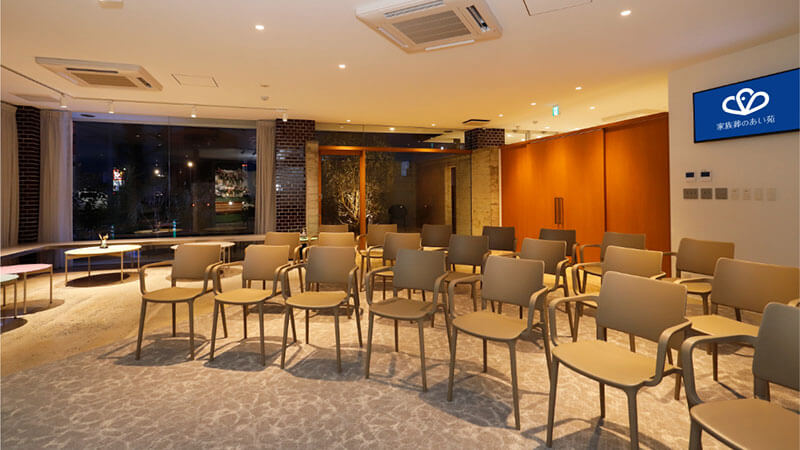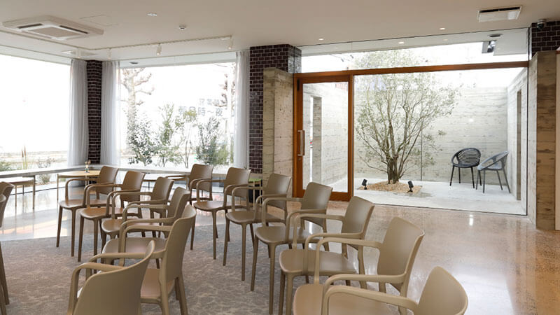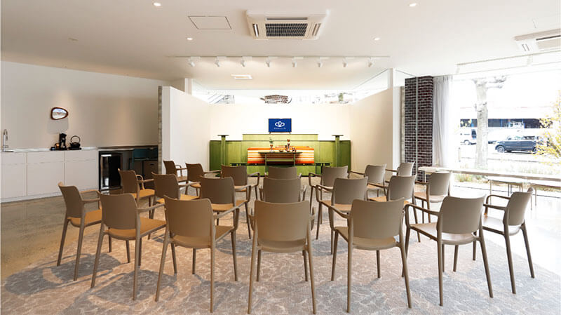 中庭に面した大きな窓から自然光が差し込む明るいホールが特徴。リビングスペース、ダイニングスペースのほか、ご自宅のようにお寛ぎいただける和室も完備。故人様との最後のひとときを自然体でお過ごしいただけます。
