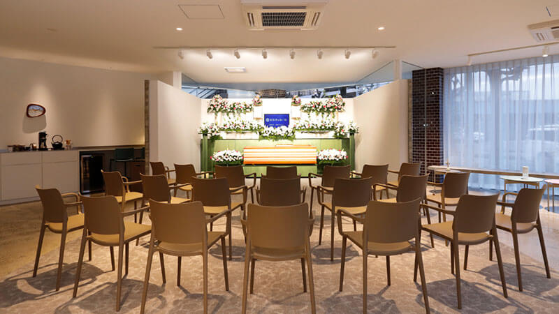 大きな窓から柔らかな自然光が差し込み、あたたかな雰囲気に包まれた空間でのお別れ。気兼ねなく集える空間で、温かみのある家族葬を執り行えます。