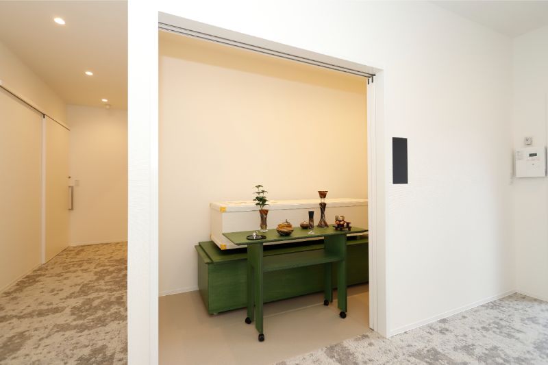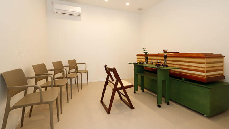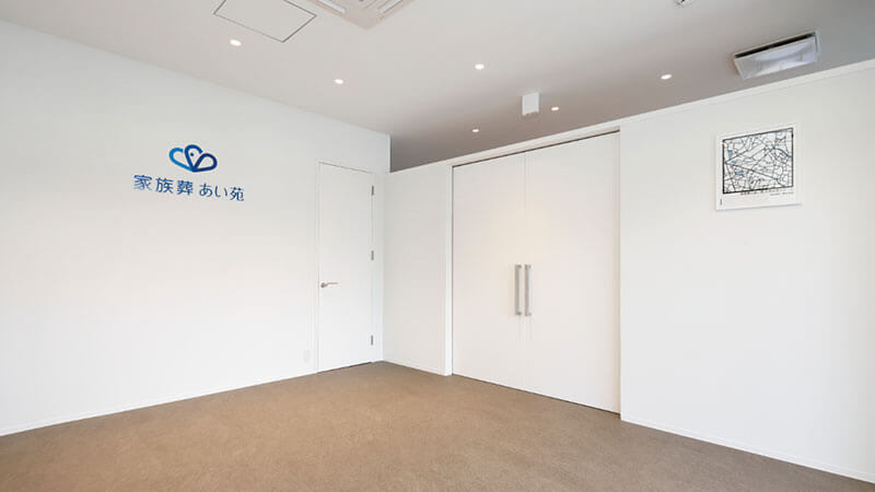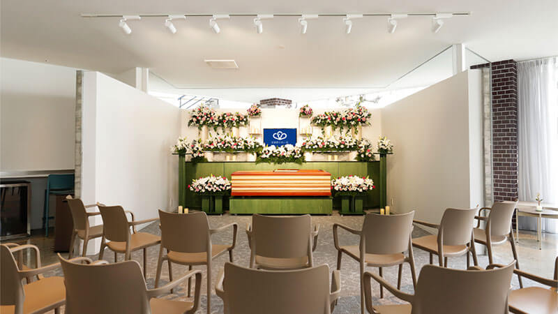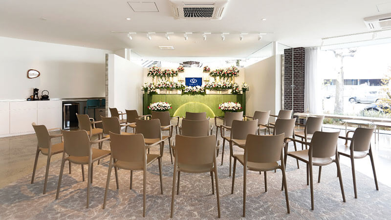 小〜中規模の家族葬専用ホールです。祭壇にプライベートスペースを隣接し、故人様とのお別れの時間を自宅のようにお過ごしいただけます。
